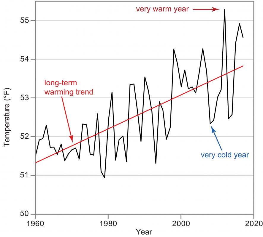 Each point on the red line shows the average temperature over the previous 30 years. As you can see, while the yearly temperatures are constantly changing, the long-term trend shows temperatures rising.