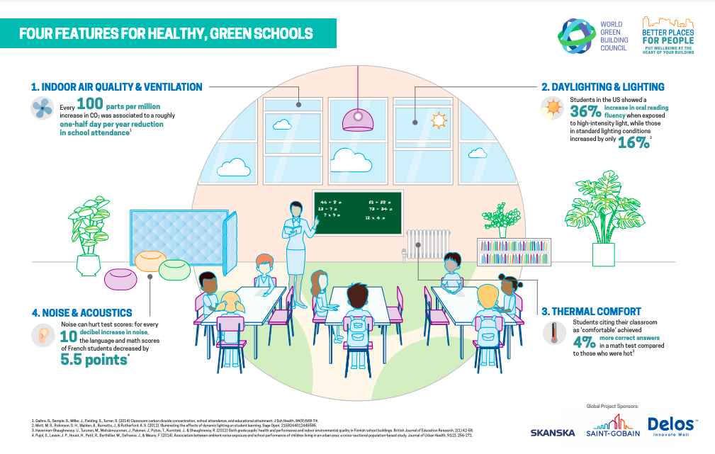 These small changes to the design of a building can make a huge change over the years! The figure below shows different features of a "green school".