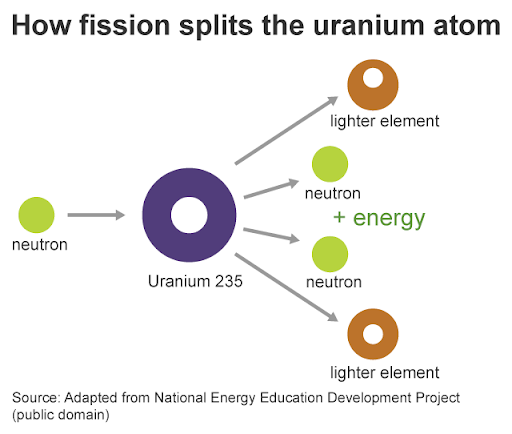 Nuclear energy is produced through nuclear fission. When Uranium atoms are split it releases energy. This energy comes out in the form of heat which is used to transform water into steam. The steam turns a turbine and generates electricity. This reaction does not directly contribute to greenhouse gas emissions.