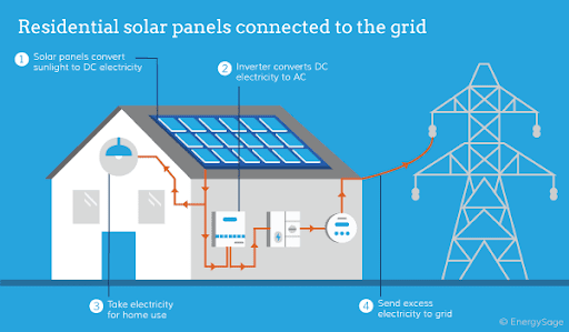 Huge solar farms generate electricity that can power nearly 180,000 homes each. Individual homeowners can also install solar panels on their roofs for their home energy needs and the excess energy can be pumped back into the grid (Fig 5.1.5).