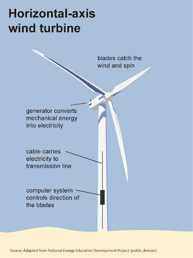 Wind energy uses the movement of the wind to turn large turbines that produce electricity.