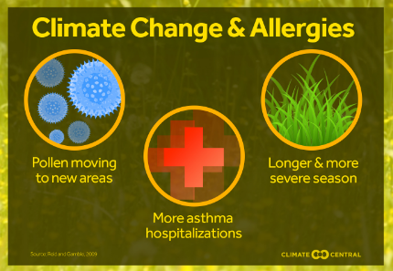 Climate change lengthens allergy season because warmer temperatures lead to an earlier spring. With a longer spring season, there is more pollen. This affects people with allergies and asthma.