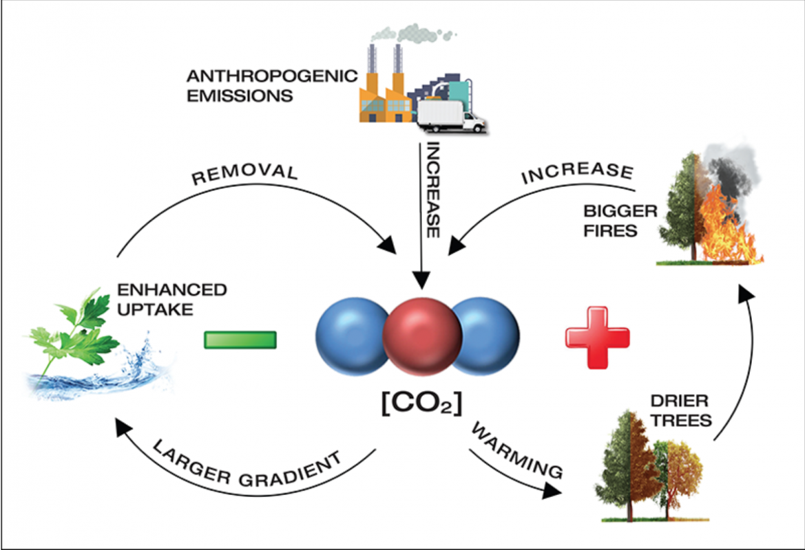Plants, as we know, take in carbon dioxide (CO₂) for photosynthesis. When there is more CO₂ in the atmosphere, plants may grow faster and absorb more of it. This process, called CO₂ fertilization, helps remove CO₂ from the air and therefore acts as a negative feedback.