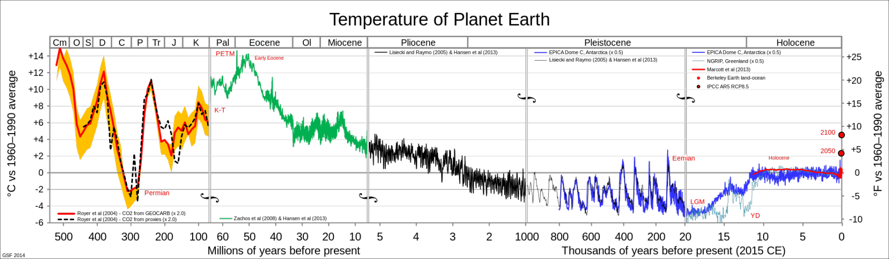Fig. 3.1.3 shows global temperature changes over the past 500 million years compared to the 1960–1990 average (the zero line). Fig. 3.1.4 shows the average temperature over the last 20,000 years – notice how farming and human civilizations developed in the last 10,000 years.