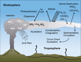 Usually, when a volcano erupts on land, it releases a much smaller amount of water vapor and more sulfur dioxide gas into the atmosphere. Sulfur dioxide has a cooling effect that lasts a few months.