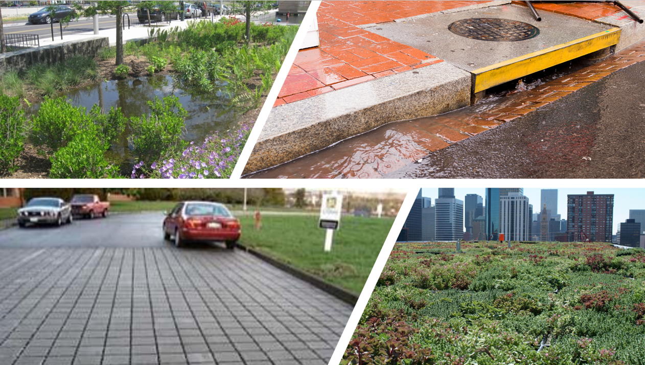 In Los Angeles, California, stormwater is collected from parking lots. Millions of gallons of water are filtered, stored, and later reused to water the landscape. Other solutions for stormwater runoff are a permeable pavement that lets water soak into it or a special roof that has soil and plants to soak up water.