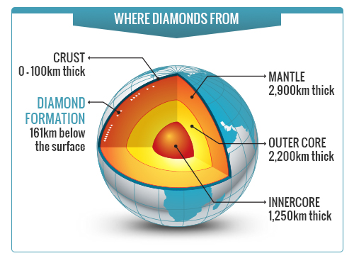 Diamonds are mainly formed around or below one hundred miles beneath the Earth’s crust, in the Earth’s upper mantle and transition zone.