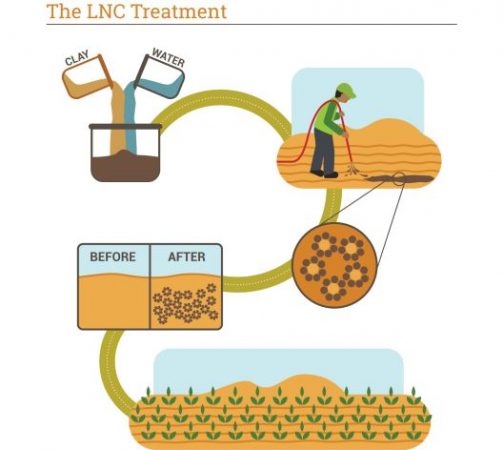 LNC is a perfectly proportioned mix of clay and irrigation water and forms a thin formula that seeps below the root zone of standard crops. The negatively charged clay binds to the positively charged sand grains and forms a snowflake-like shape around the grains. This shape increases its surface area, thus improving water and nutrient retention. LNC can be easily spread by different irrigation systems.